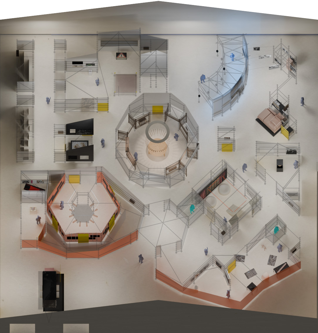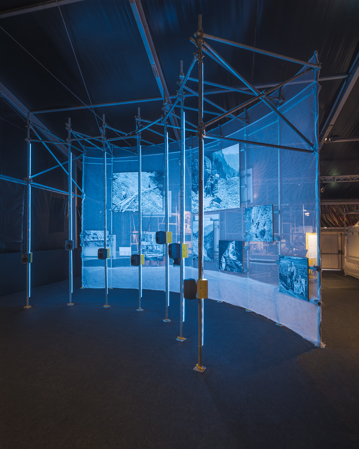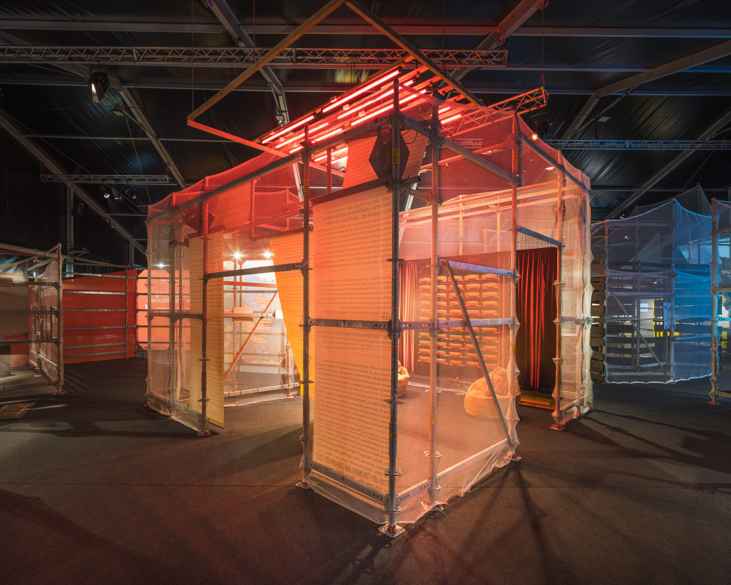 This collaboration with Curious Space was a large pop up exhibition experience for Foire du Valais in Martigny, Switzerland, which explored local traditions in a labyrinth of immersive spaces. The majority of the structure consists of ringlock scaffolding and netting gauze, to minimise material waste. My input included assisting with design, full Rhino model and full construction drawings for scaffold and content mounts.