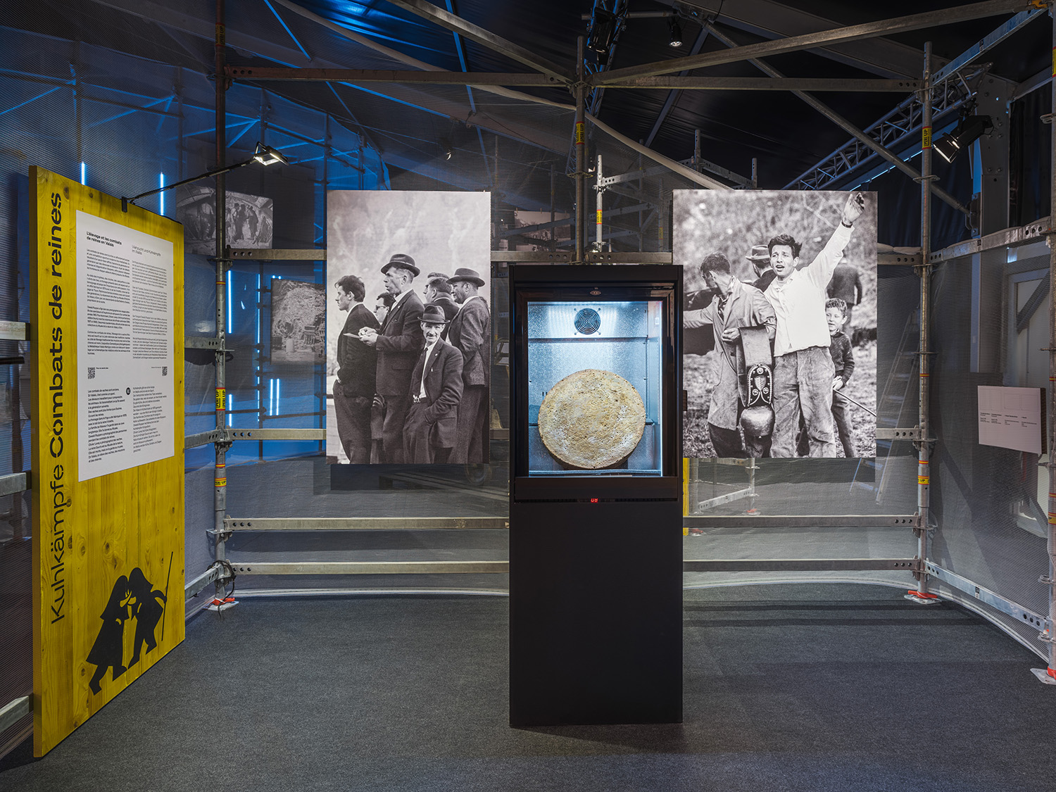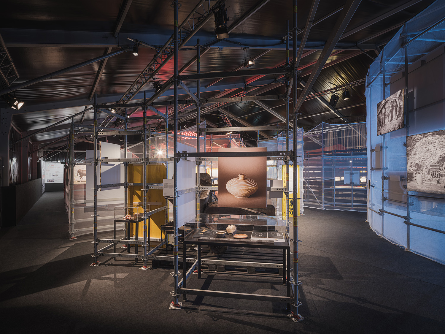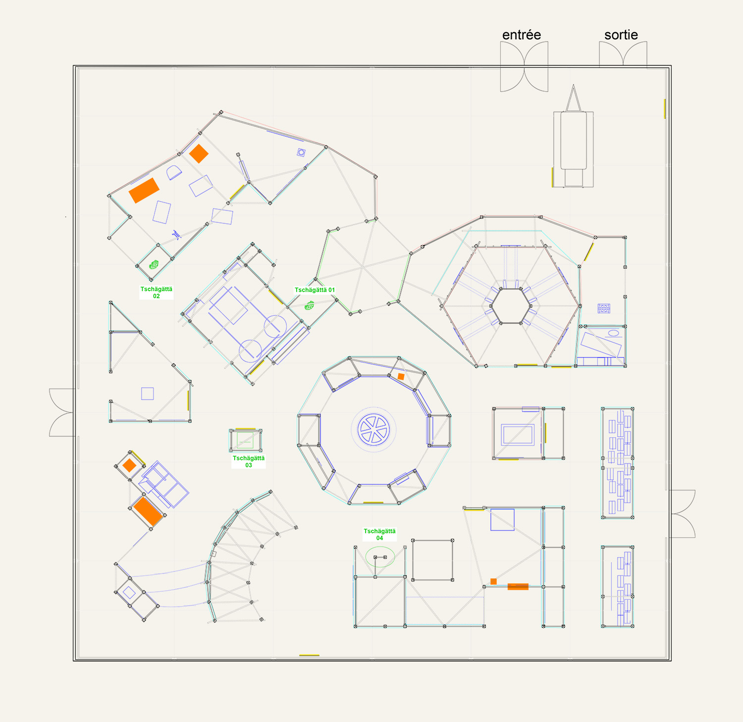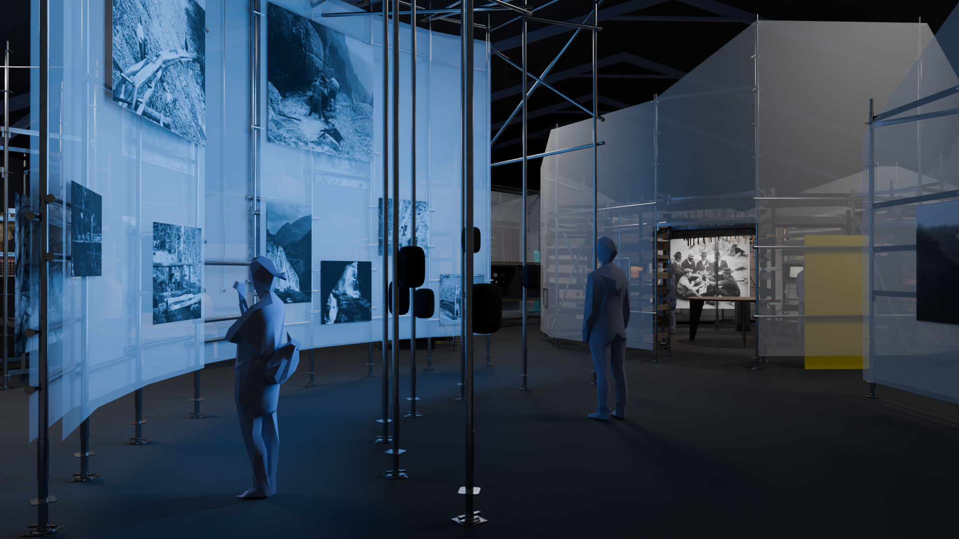 This collaboration with Curious Space was a large pop up exhibition experience for Foire du Valais in Martigny, Switzerland, which explored local traditions in a labyrinth of immersive spaces. The majority of the structure consists of ringlock scaffolding and netting gauze, to minimise material waste. My input included assisting with design, full Rhino model and full construction drawings for scaffold and content mounts.
